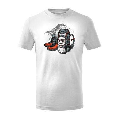 Koszulka dla dzieci dziecięca z plecakiem z górami w góry turystyczna trekkingowa biała